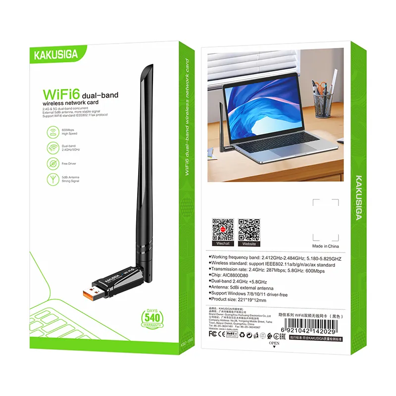 Clé WiFi KAKUSIGA Wifi6 USB double bande (2,4 GHz & 5,8 GHz) – Jusqu’à 887 Mbps, avec antenne 5 dBi, compatible Windows 7/8/10/11, installation Plug & Play.