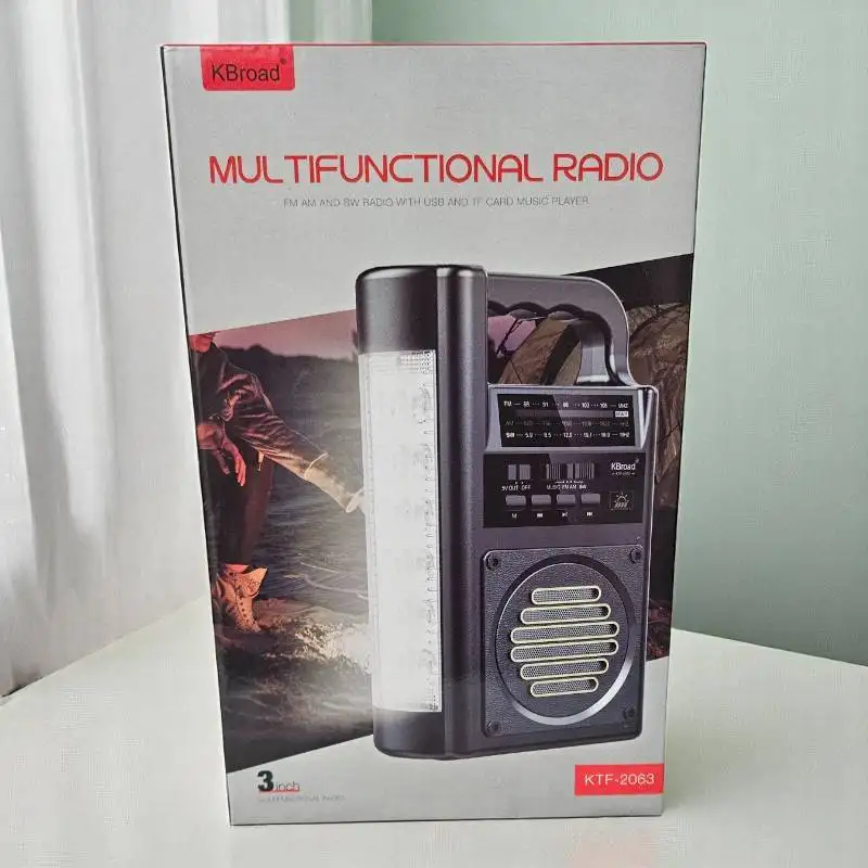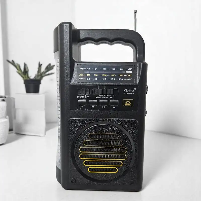 Radio Solaire Multifonction et Haut-Parleur KTF-2063 KBroad – Portable avec Bluetooth, USB/TF Card, AM/FM/SW, Batterie 3000mAh, LED 5W – USB/TF Card, AM/FM/SW, lampe LED et batterie rechargeable 3000mAh. Idéale pour camping, outdoor et urgences.